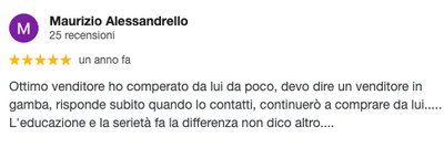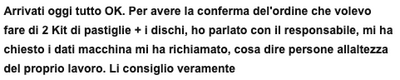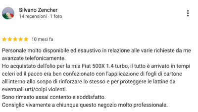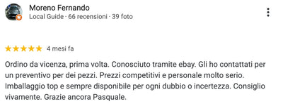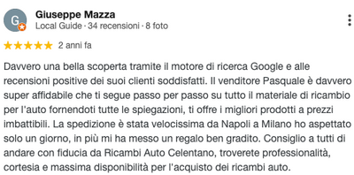 Davvero una bella scoperta tramite il motore di ricerca Google e alle recensioni positive dei suoi clienti soddisfatti. Il venditore Pasquale è davvero super affidabile che ti segue passo per passo su tutto il materiale di ricambio per l'auto fornendoti tutte le spiegazioni, ti offre i migliori prodotti a prezzi imbattibili. La spedizione è stata velocissima da Napoli a Milano ho aspettato solo un giorno, in più mi ha messo un regalo ben gradito. Consiglio a tutti di andare con fiducia da Ricambi Auto Celentano, troverete professionalità, cortesia e massima disponibilità per l'acquisto dei ricambi auto.